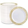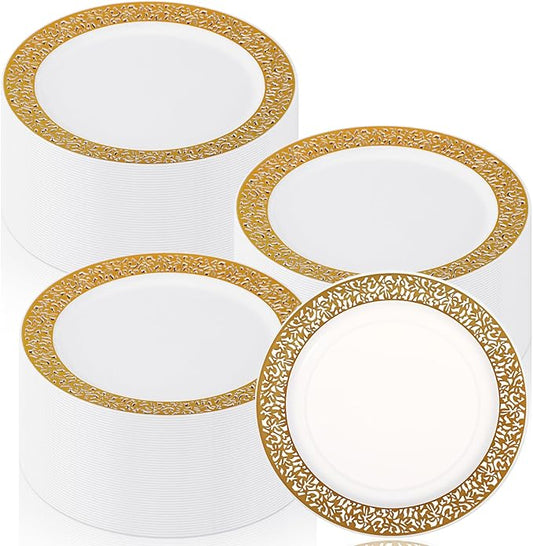 Premium heavyweight plastic disposable plates white color gold lace | 7.5" & 10.25" Plastic Dinner Plates, White Plastic Plates with Gold Rim,Gold Lace Plates,Gold Plastic Plates for Weddings Celebrations and Parties